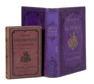 Joint : Annuaire diplomatique et consulaire pour 1882. Sur la couverture de cet annuaire figure la même figure allégorique, ce qui nous inspire l'idée que ce cartonnage de la Géographie serait un volume relié spécialement pour les diplomates et le personnel diplomatique. De plus, dans l'un et l'autre cas, la percaline est mauve... serait-ce une couleur de référence ?
