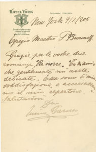 Enrico CARUSO (1873-1921). — L.A.S., New York 9 / 2 / 1905, au Maestro Platon Brounoff ; 1 page in-8 à en-tête et vignette de l’Hotel York ; en italien.
