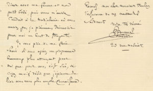 • Emmanuel CHABRIER. — L.A.S., Paris 14 mars 1877, à Albert Vanloo ; 2 pages et demie in-12 (légères fentes aux plis réparées). [77-2]