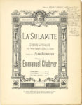 La Sulamite, scène lyrique pour mezzo-soprano et chœur de femmes avec orchestre, sur une poésie de Jean Richepin, a été écrite en 1884, et créée le 15 mars 1885 aux Concerts Lamoureux sous la direction de Charles Lamoureux, avec Mme Brunet-Lafleur (la future Mme Lamoureux), à qui l’œuvre est dédiée. Chabrier en réalisera en 1890 une nouvelle orchestration en 1890, qui sera donnée le 21 février 1892 par les mêmes interprètes.