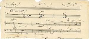 Fragment de la partie des « 1ers violons », « 5e pupitre » (indication portée au verso, et en tête de la musique), du n° 1 (Idylle) de la Suite pastorale, orchestration par Chabrier de quatre de ses Pièces pittoresques, créée le 4 novembre 1888 à Angers, sous la direction du compositeur.