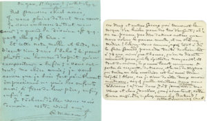 • Emmanuel CHABRIER. — 2 L.A.S., janvier-juillet 1892, au compositeur Victorin Joncières ; 3 pages in-12, la 2e avec adresse au dos. [92-3 et 92-80]