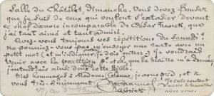 « Vous devez penser que je suis de ceux qui veulent s’extasier devant ce chef-d’œuvre incomparable de César Franck, que j’ai tant aimé et tant admiré ». Il aimerait aussi venir à la répétition « avec la partition p[ian]o et ch[ant], que le Maître m’a donnée, j’entendrais ainsi deux fois cette Bible »...