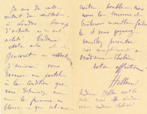« Je travaille énormément et j’aimerai vous montrer mes gravures. Cela me passionne et je veux arriver à faire très très bien. Je suis du reste content du résultat, à Londres beaucoup d’artistes m’en ont acheté Tadema entre autres et ici Goncourt en collectionne. J’aimerais vous donner un pastel à la condition que vous détruisiez avec moi la femme en blanc qui est une croûte horrible. Mais nous la crèverons et brûlerons ensemble. Faites-le et vous gagnerez »…