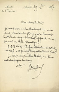 • [Emmanuel CHABRIER]. — Joris-Karl HUYSMANS (1848-1907). — L.A.S., 29 décembre 1887, à Emmanuel Chabrier ; 1 page in-8 à en-tête du Ministère de l’Intérieur. [88-69n.]