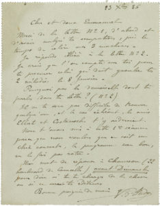 « Cher et doux Emmanuel […] on compte sur toi pour te procurer celui qui doit gueuler tes 2 mélodies, le 8 janvier. […] Il ne te sera pas difficile de trouver quelqu’un et le cas échéant, les amis Ellat et Costanoch t’y aideront. Nous t’avons mis à cette 1ère séance parce que nous voulons que ce soit un chic concert, le programme sera bon, ne le fais pas rater »...