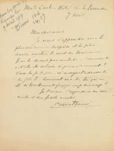 Gabriel FAURÉ. — L.A.S., Monte Carlo 7 avril [1919], à un ami [probablement Edmond Duvernoy] ; ¾ page in-4.