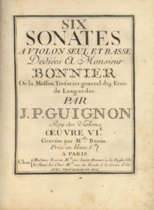 Jean-Pierre GUIGNON (1702-1774). — Six Sonates à violon seul et basse. — Dédiées à Monsieur Bonnier de la Mosson, Trésorier général des États du Languedoc. Par J.P. Guignon Roy des Violons. — Œuvre VIe. Gravées par Melle Bertin...