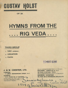 Gustav HOLST (1874-1934). — Hymns from the Rig Veda. — Third Group (Londres, Genève, J. & W. Chester, 1920) ; in-4 broché (petites marques de rouille aux agrafes).
