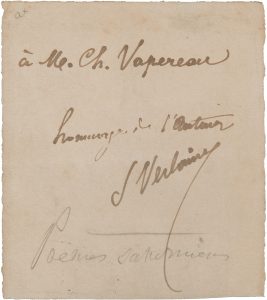 VERLAINE (Paul) 1844-1896 Envoi manuscrit à l'encre sur le f. blanc des Poèmes Saturniens : « A M. Ch. Vapereau Hommage de l'auteur P.Verlaine » en dessous duquel le poète à ajouté au crayon « Poèmes Saturniens ».