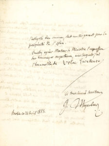 Giacomo MEYERBEER (1791-1864). — L.A.S., Berlin 21 avril 1853, au ministre de l’Instruction publique [Hippolyte Fortoul] ; 4 pages in-4 à son chiffre.