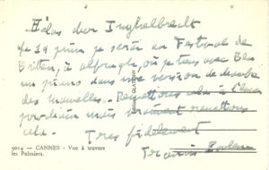 Francis POULENC. — L.A.S., [juin 1958], au chef d’orchestre Désiré-Émile Inghelbrecht ; 1 page oblong in-12 au dos d’une carte postale de Cannes.