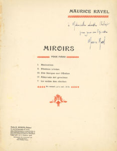 Envoi autographe signé à l’encre bleue sur la page de titre : « à Mademoiselle Linette Chalupt pour jouer sur l’épinette Maurice Ravel ».