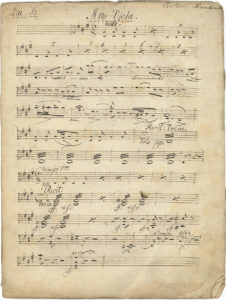 Cette partie d’alto est complète, et comprend l’introduction, deux épisodes marqués « Récit », un Allegretto, le « Thema » suivi de deux Variations, puis le « Finale ». Soigneusement notée à l’encre brune sur papier à 12 lignes, elle présente un épisode biffé de 48 mesures dans le Finale.