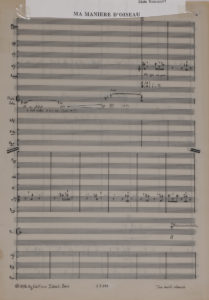 Alain BANCQUART (né 1934). — Manuscrit musical autographe signé, Ma manière d’oiseau pour flûte et 8 instruments, [1978] ; titre et 22 feuillets 37,5 x 27,5 cm (titre imprimé collé en tête du manuscrit).