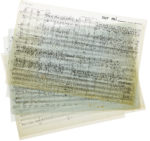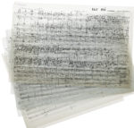 Il est soigneusement noté à l’encre de Chine au recto de grands feuillets oblongs de papier calque, présentant pour chaque page (sauf la dernière) 2 systèmes de 6 portées plus une ou deux lignes pour les percussions.