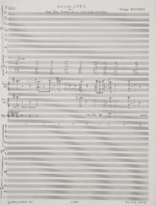 Philippe BOESMANS (né 1936). — Manuscrit musical autographe, Doublures, [1977] ; [1]-44 feuillets 43 x 32 cm (petite déchirure au dernier feuillet). — Partition d’orchestre de cette pièce concertante pour harpe, piano, percussion et...