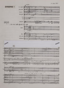 Le manuscrit est soigneusement noté à l’encre de Chine sur papier calque, préparé pour le clichage, avec des collettes de papier blanc pour masquer les portées non utilisées. À la fin, une collette dactylographiée donne les dates : « 23/27 mars 1983. 1ère instrumentation 2 février/19 mars 1984. Révision et réinstrumentation décembre 1990 / 18 mars 1991 ».