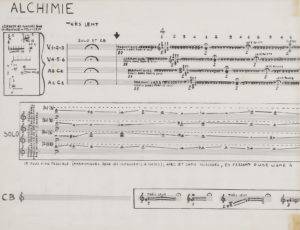 Le manuscrit est noté à l’encre de Chine sur papier calque (traces de scotch) ; manque l’élément « Combat ». Œuvre aléatoire, permettant d’interpréter divers éléments : Prémisses, Statisme, Alchimie, Passage, Action, etc.