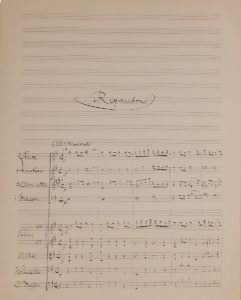 Ce Rigaudon est écrit pour un orchestre formé de 2 flûtes, hautbois, 2 clarinettes, basson, et les cordes. En ut, il est marqué All° moderato. Le manuscrit est noté à l’encre brune sur papier à 20 lignes.