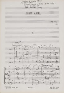 Le manuscrit est soigneusement noté à l’encre de Chine sur papier calque avec 4 systèmes de 4 portées par page ; il est signé en fin et daté « le 19 septembre 1982 ».