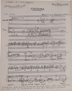 Tolia NIKIPROWETZKY (1916-1997). — Manuscrit musical autographe signé, Anaphora, Séquence pour violoncelle et piano, 1987 ; titre et 11 feuillets 37,5 x 28 cm.
