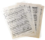 — On joint le manuscrit musical autographe signé de la réduction violoncelle-piano, portant le Concerto (In Dark and Blue) ; 29 feuillets 37 x 27 cm. Il est soigneusement noté à l’encre de Chine sur papier calque, avec des traces de correction par grattage, et 3 mesures biffées (p. 24) ; il signé en fin du dessin d’un soleil rayonnant entouré des lettres OANA, et daté « 22 XI 89 Sanctae Cecilae gratias ».