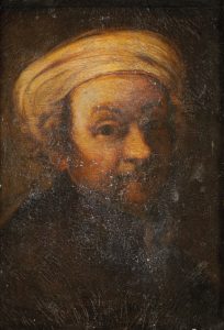 Huile sur papier. Marouflé sur toile. H. 28 - L. 20 cm D'après l'auto-portrait en saint Paul (1661) du Rijksmuseum (Amsterdam).