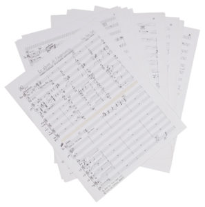 Le manuscrit est soigneusement noté à l’encre noire sur papier à 18 portées ; on relève des corrections au tipex ; des portées ont été blanchies pour le clichage.