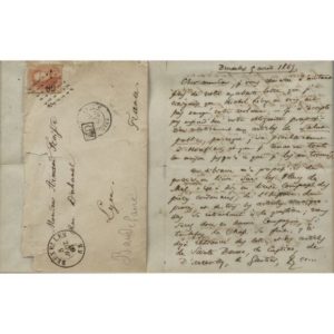 Bruxelles, 5 avril 1865, 2 pages in-8, enveloppe conservée affranchie avec l'adresse : " Monsieur Armand Fraisse. Rue Duhamel. Lyon ". Lettre et enveloppe encadrées.
