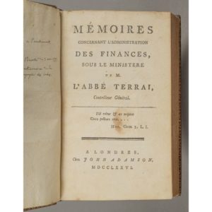 Édition originale. Cet ouvrage dresse une sévère critique contre les aptitudes financières de l'abbé Terray, contrôleur général des finances de 1769 à 1774 sous Louis XV. Dès sa prise de fonction, l'abbé Terray fait face à une situation dramatique. Il impose alors des mesures énergiques pour redresser les finances royales, multipliant les impôts et les dépenses (déjà!). Terray fut perçu comme le responsable de la banqueroute de la France et de la déchéance du règne de Louis XV. La dernière partie concerne la Compagnie des Indes.