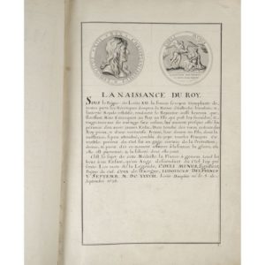 Exceptionnelle copie manuscrite de l'ouvrage offert en 1702 à Louis XIV par l'Académie Royale des Inscriptions et Médailles (Imprimerie royale). De la naissance du dauphin en 1638 à l'union de la France et de l'Espagne avec l'avènement du duc d'Anjou au trône d'Espagne en 1700, 286 événements sont illustrés à travers ces médailles. Tiré à 200, on ne connaît aujourd'hui qu'une soixantaine d'exemplaires imprimés de cet ouvrage.