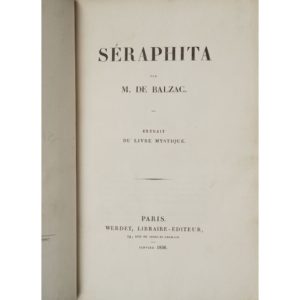 Première édition séparée de ce roman, qui composait le tome 2 du Livre mystique, paru en 1835. Elle ne fut tirée qu'à 300 exemplaires. Séraphita est un roman fantastique qui aborde le thème de l'androgynie, ici ramené au mythe antique de la perfection humaine. Le personnage principal, à la fois Séraphita et Séraphitüs, finit par s'élever dans les sphères supérieures ; ces évocations surnaturelles et l'angélisme constituaient un sujet pleinement diffusé par le courant romantique. Balzac tente d'expliquer rationnellement les faits surnaturels, dont les guérisons miraculeuses qui seraient des phénomènes physiologiques produits par le magnétisme.
