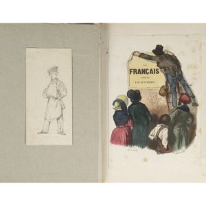 Cet exemplaire a en outre été truffé de 13 dessins originaux et aquarelles d'Henri Monnier, Pauquet... et de 152 gravures en couleurs ou en noir, sur papier volant, certaines sur papier de Chine.