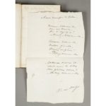 Joint monté sur onglet sur la première garde : un f. autographe signé de Victor Hugo (in-8 plié) contenant un poème de 3 quatrains intitulé "Chanson venue par la fenêtre". C'est une version autographe du poème p. 205 intitulé "Autre guitare" ; le vers 8 débute par "Dormez" au lieu de "Rêvez" dans la version manuscrite. Cette différence et celle du titre en font peut-être une version antérieure à celle imprimée.