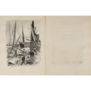 Maquette originale contenant 31 gouaches originales de Paul Baudier, premières ébauches en noir, avec parfois rehauts d'encre de Chine et de pierre blanche, dont à 6 pleine page, et 25 à demi page. Texte contrecollé sur papier fort, souvent répété, pas toujours suivi ; certaines parties, justification du tirage, page de titre… manuscrites au crayon.