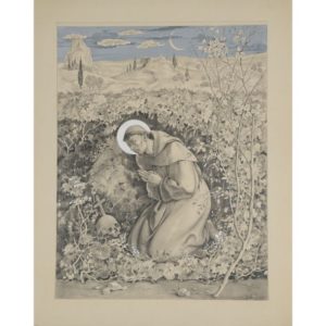Ens. de 16 grands dessins originaux au crayon, gommés, et certains avec rehauts de blanc et de gris, dont 12 de même taille : 31,5x24 cm - et 4 grands (36x29 cm environ pour 3, et un de 42,5x31,5 cm). Pour : Les petites fleurs de Saint-François choisies et traduites par Frédéric Ozanam. Gibert jeune, Paris 1942.