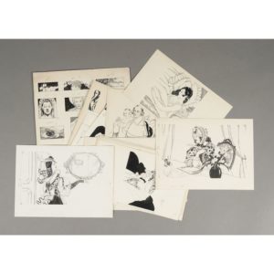Ens. de 23 planches de petits dessins à l'encre de Chine avec rehauts de blanc, tous formats : figures à pleine page, bandeaux, vignettes et culs de lampe ; annotations au crayon.