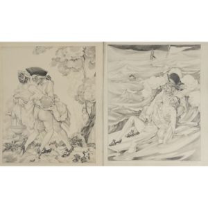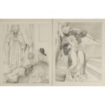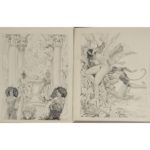 Ens de 9 dessins originaux (env. 28 x 22 cm), signés, au crayon, un rehaussé à l'encre de chine et à la gouache blanche, tous protégés sous un f. de papier fin.