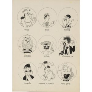 1951. Encre de chine, non signé, 32x24 cm. Page de garde, les principaux personnages : 9 portraits en médaillons. Traces de crayon, petit tache. Œuvre intégral : 3924.