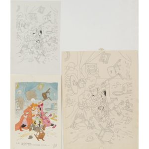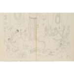 Vers 1955. 3 séries comprenant chacune un dessin à l'encre de chine (inédit ?) (pp. 22, 35, 45), non signé, 31,5x24 cm ; une réduction imprimée de ce dessin, mise en couleurs, avec titre et légende tapuscrits, formats divers (environ 23x16 cm) ; et un film lithographique de cette réduction. - Pas au cat. de l'Œuvre intégral.