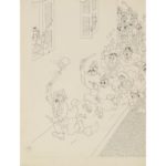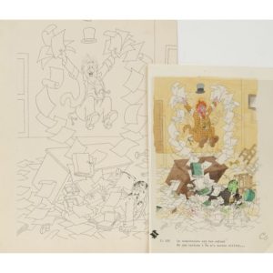 Vers 1955. 3 séries comprenant chacune un dessin à l'encre de chine (inédit ?) (pp. 97, 114, 131), non signé, 31,5x24 cm ; une réduction imprimée de ce dessin, mise en couleurs, avec titre et légende tapuscrits, formats divers (environ 23x16 cm) ; et un film lithographique de cette réduction. - Pas au cat. de l'Œuvre intégral.