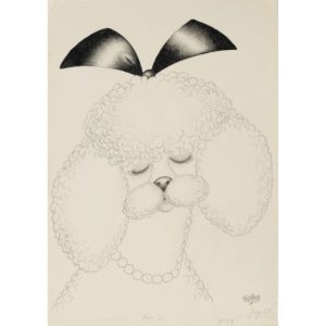 Les Éditions du livre, 1964. Encre de chine, signé, n° 53, p. 87, caniche noeud noir, collier de perle. 40x28,5 cm. Œuvre intégral 8167.
