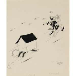 Les Éditions du livre, 1964. Encre de chine, signé, 34x28 cm, Scène n° 16, p. 31, chien dans sa niche poursuivant un prétendant. Œuvre intégral 8134.
