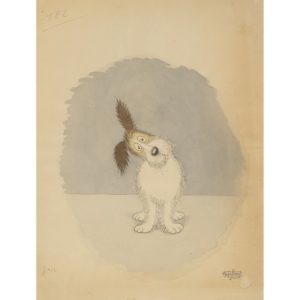 Les Éditions du livre, 1964. Encre de chine aquarellée, signé, 32x24,5 cm. Chien n° 12, à l'écoute. Œuvre intégral 8123. Taches.