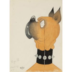 Les Éditions du livre, 1964. Encre de chine aquarellée, signé, Chien n° 9, p. 18, bouledogue au monocle. 32x24 cm. Œuvre intégral 8133.