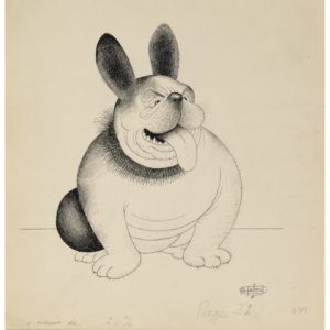 Les Éditions du livre, 1964. Encre de chine, signé, chien n° 11, p. 22, bouledogue tirant la langue. 29x28 cm. Œuvre intégral 8126.