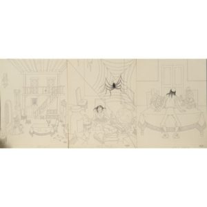André Sauret, 1954. Ens. de 4 feuilles de dessins à l'encre de chine, tous signés, 31,5x24 cm. Œuvre intégral : une feuille réunissant 3 dessins : p. 95, 7530 + p. 171, 7539 + p. 211, 7540 - pour acte II, sc. 2, p. 77, 7529 - pour acte I, sc. 4, p. 37, 7526.