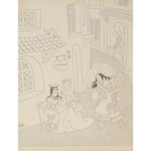 André Sauret, 1954. Acte II, sc. 3 : "la femme est le potage de l'homme", Encre de chine, signée, 31,5x24 cm. Œuvre intégral : p. 45, 7568.