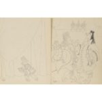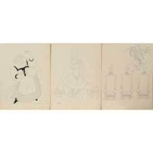 André Sauret, 1954. Ens. 6 dessins à l'encre de chine, dont 3 signés, 31,5x24cm. Œuvre intégral : pour acte III, sc. 2, p. 81, 7505 - pour Vadius, Trissotin, acte III, sc. 3, p. 19-05, 7507 - pour Chrisale, p. 73, 7504 - pour Henriette, p. 16, 7497 + tirage en réduction joint - pour Martine, acte II, sc. 6, p. 169, 7514 - pour Vadius, p. 101, 7506.
